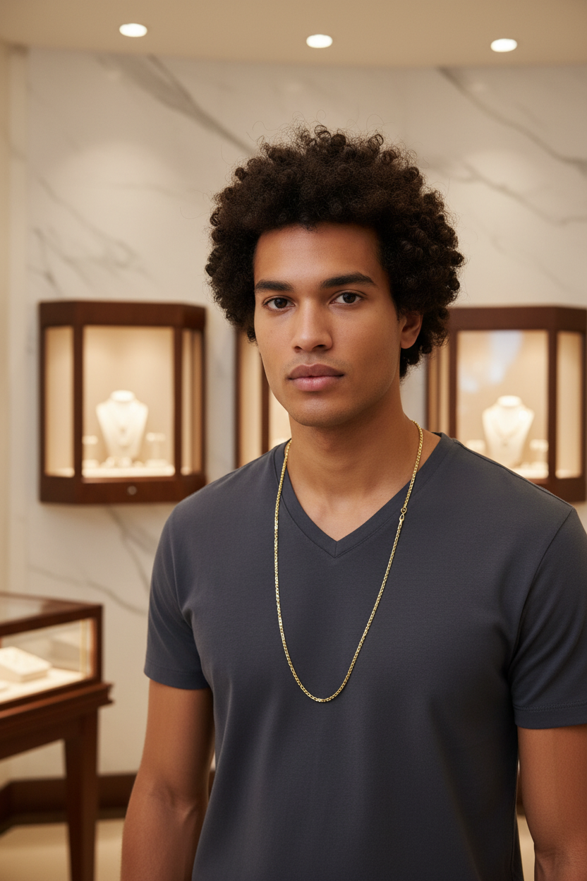This 18k solid gold Figaro chain exemplifies timeless luxury craftsmanship. The distinctive three-to-one link pattern creates visual depth while maintaining elegant proportions, making it versatile for layering or standalone wear. At 24 inches, this length sits perfectly at the collarbone, offering a refined presence without overwhelming the neckline. Crafted from genuine 18k gold, it delivers lasting durability and a warm, lustrous finish that only solid gold provides. An investment piece that transcends trends.